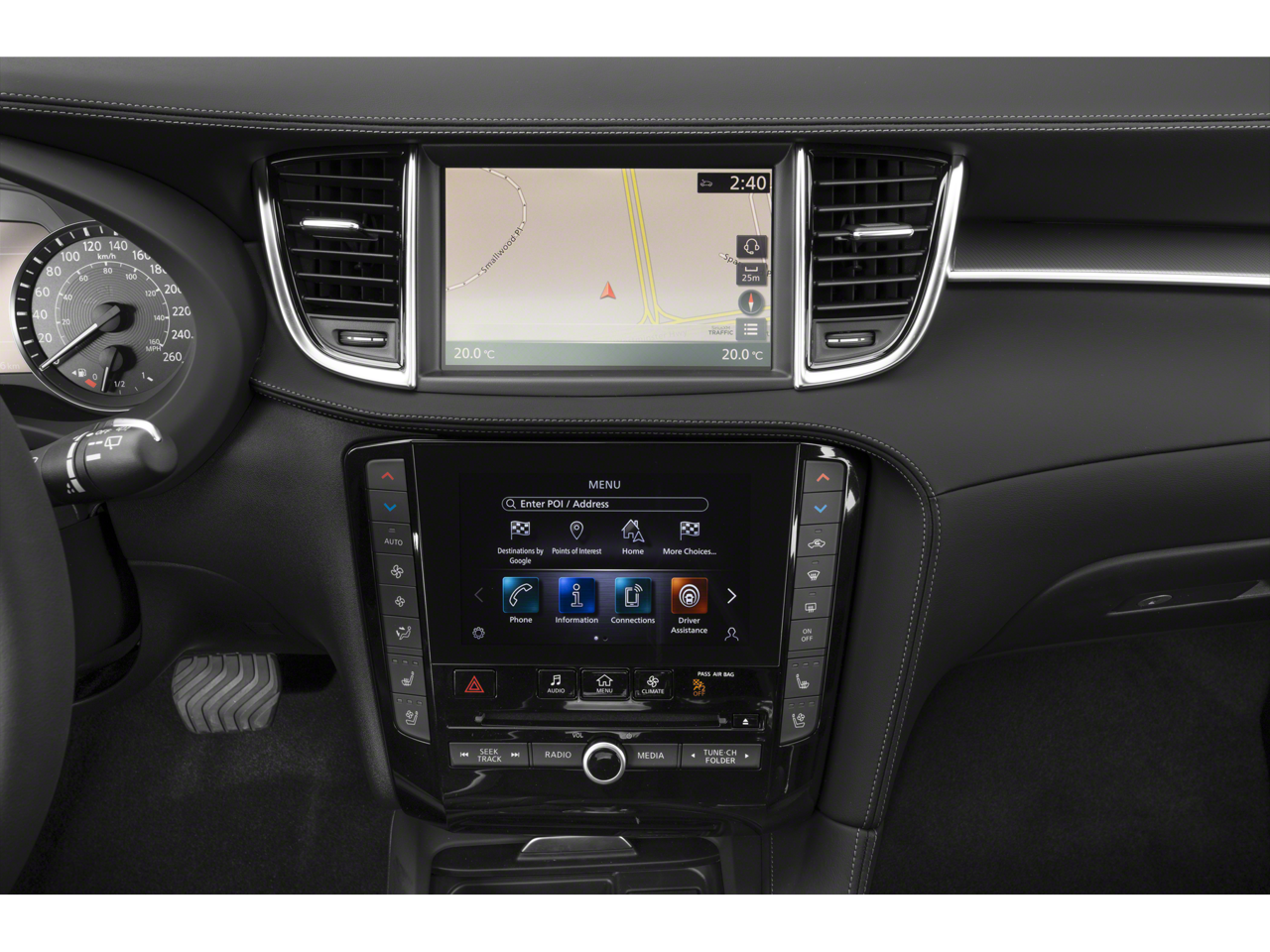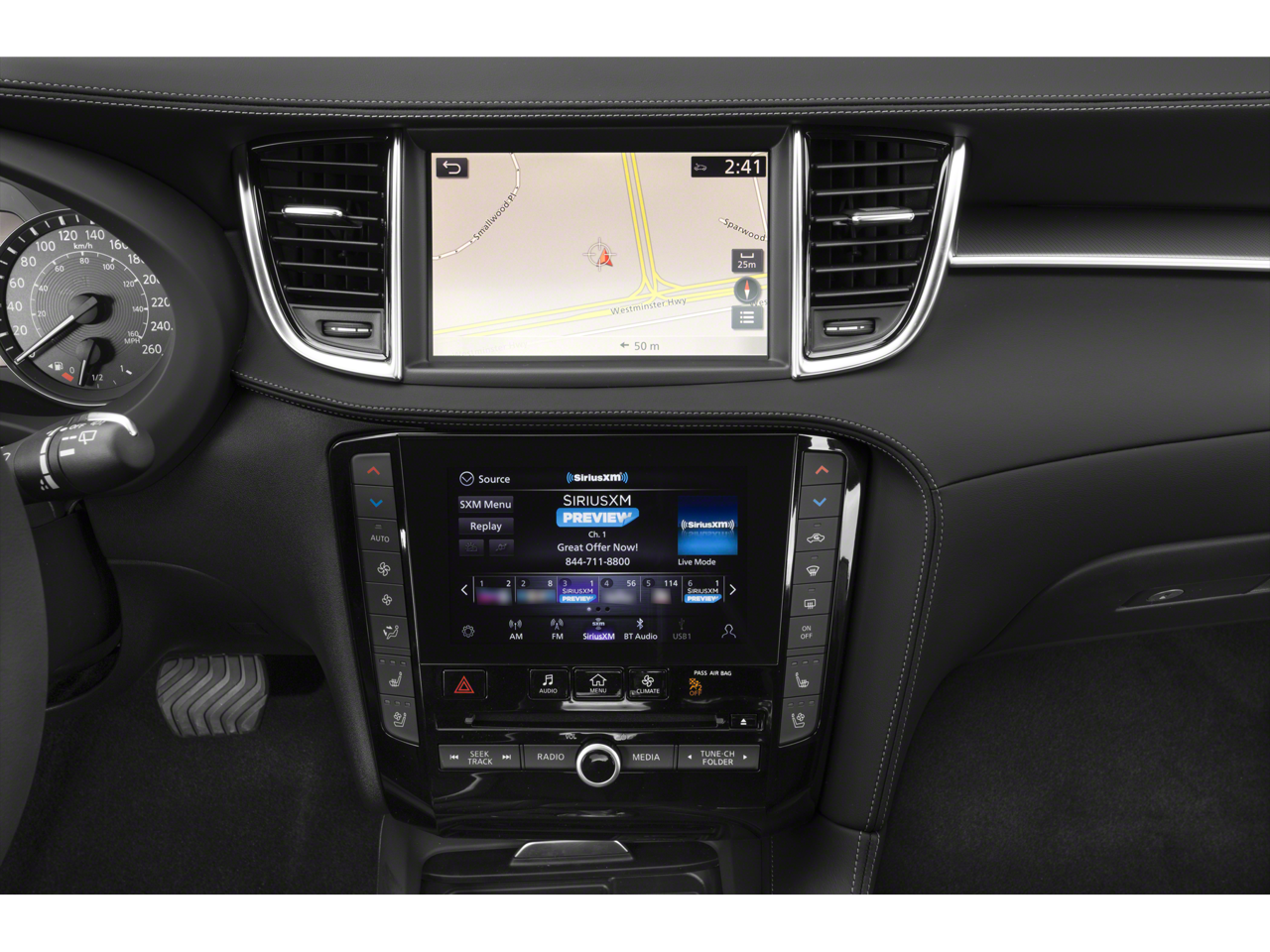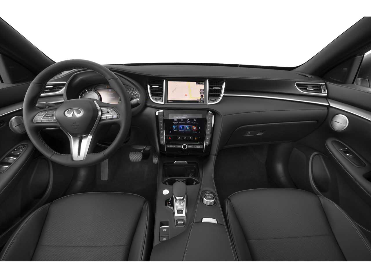 - Radio: Bose Performance Series Premium Audio -inc: 16 speakers, metallic speaker grilles on tweeters, INFINITI InTouch w/navigation and dual display system w/upper 8" and lower 7" HD touch screens, wireless Apple CarPlay, Android Auto, HD Radio technology, SiriusXM radio w/advanced audio features and 90-day complimentary trial, INFINITI voice recognition, INFINITI InTouch services, Siri eyes free and Wi-Fi hotspot